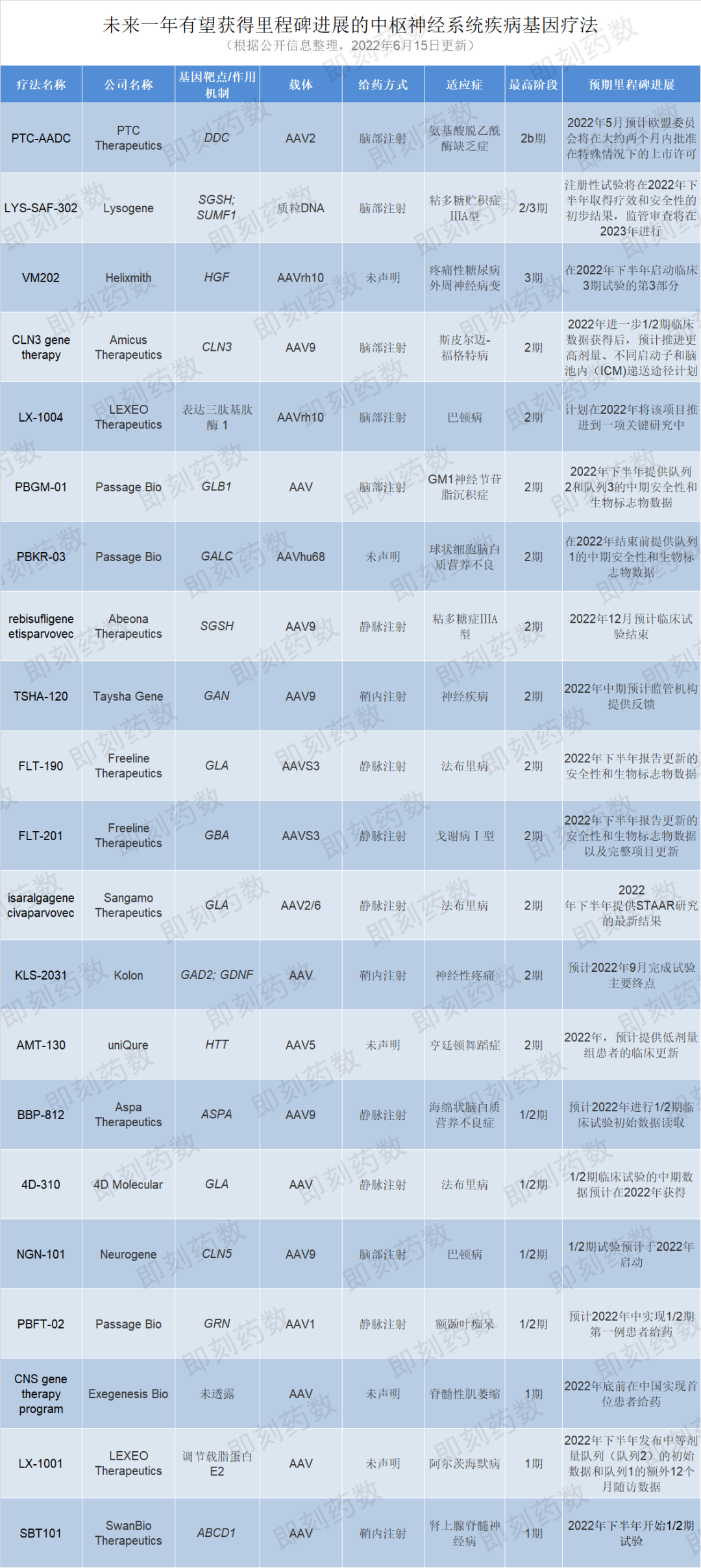 今年有13款中枢神经系统疾病基因疗法已获得临床积极进展,详情请见下表。