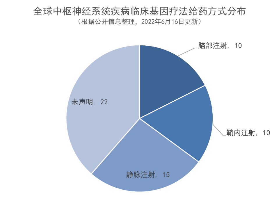中枢神经系统疾病基因疗法给药方式主要分为三大类:脑部注射、鞘内注射和静脉注射,目前这三类给药方式在临床阶段的占比并无太大差异。静脉注射对于递送载体的要求较高,需要载体可以有效穿越血脑屏障,将药物递送至中枢神经系统。脑部和鞘内注射虽然可以直接将疗法递送至中枢神经系统,但如何检测药物精准递送至大脑仍为一大挑战。
