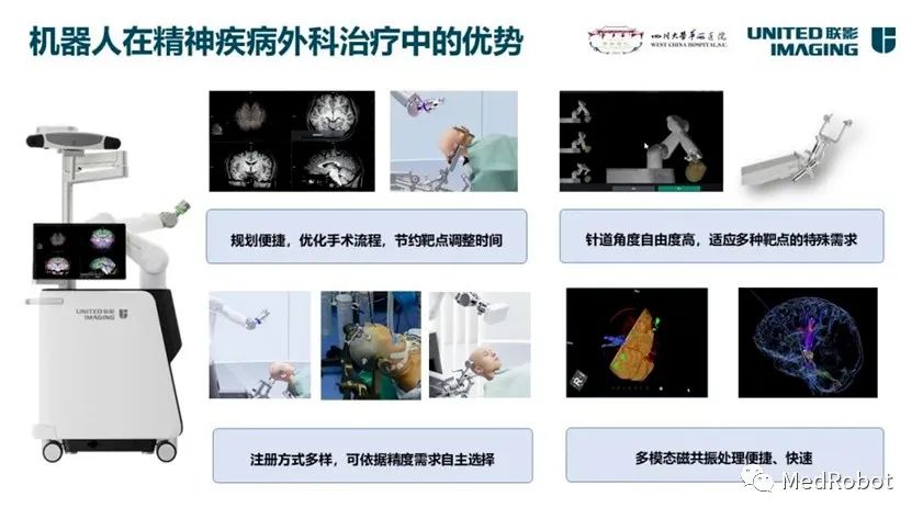手术机器人在精神疾病外科治疗中的优势:规划便捷,优化手术流程,节约靶点调整时间;针道角度自由度高,适应多种靶点的特殊需求;注册方式多样,可依据精度需求自主选择 多模态磁共振处理便捷、快速。