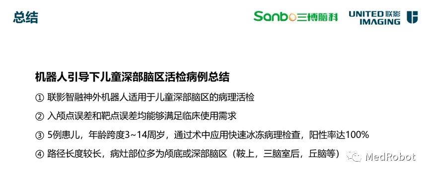 联影机器人引导下儿童深部脑区活检病例总结:①联影智融神外机器人适用于儿童深部脑区病变的病理活检;②入颅点误差、靶点误差均能满足临床使用需求;③路径长度较长,病灶部位多为颅底或深部脑区(鞍上,三脑室后,丘脑等)。